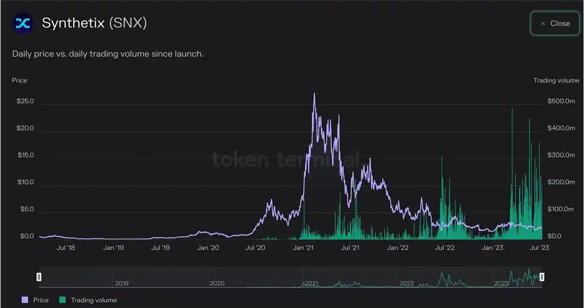 以下是来源于 Token Terminal 的数据图表,显示出了 SNX 的价格以及利用 Synthetix 流动性开展的交易量。如下图所示,近期的链上活动和 SNX 的当前价格中间存在一定的矛盾。