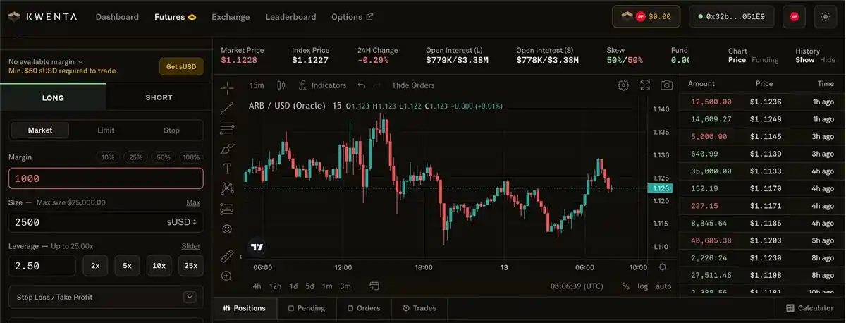 到目前为止,Synthetix 的总体锁住使用价值(TVL)为 3.75 亿美金,这就意味着早已抵押了使用价值 3.75 亿美元 SNX。一个是建立在 Synthetix 以上并利用该协议流动性的例子是 Kwenta。Kwenta 是一个在 Optimism 里的不断商品期货协议,本身没有原生态流动性,而是通过 Synthetix 传承流动性。Kwenta 上的各种买卖对都以 sUSD 计费,因此为了买卖这种生成资产,客户必须通过质押贷款 SNX(或在市场中选购 sUSD)来锻造 sUSD。