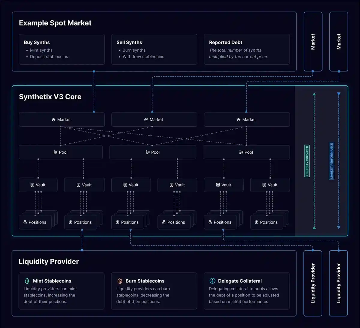以下是 Synthetix V3 现货市场的构造简述:客户把它资产存进保险库,这种保险库被导入到特定池里。这种池能够被协议应用,用于在 Synthetix 流动性池以上建立销售市场。这些市场是客户在建立在 Synthetix 里的 dapp(如 Kwenta)上进行交互对象。