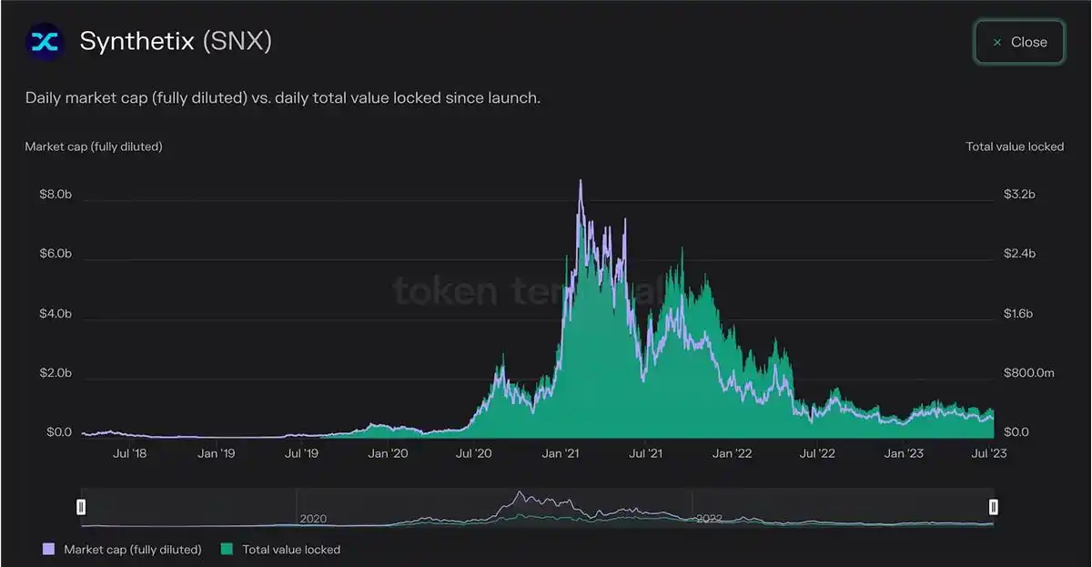 以下是 TVL 的数据图表,在 Synthetix 的情形下,它和 SNX 的价钱紧密相关,如图所示。主要是因为如同上面提到的,SNX 是唯一能够在这个协议上质押的资产。