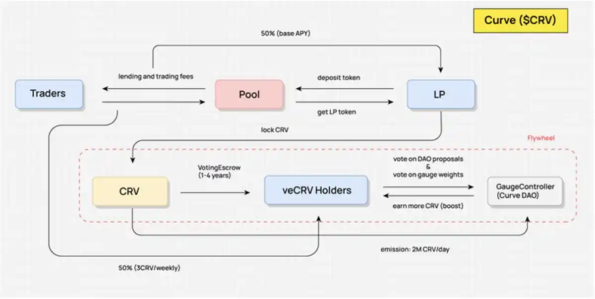 使各方长期利益相对协调一致(veCRV 持有者也享有手续费分成,即流动性提供者、交易方、token 持有者、协议这四方的利益被协调到了一起);