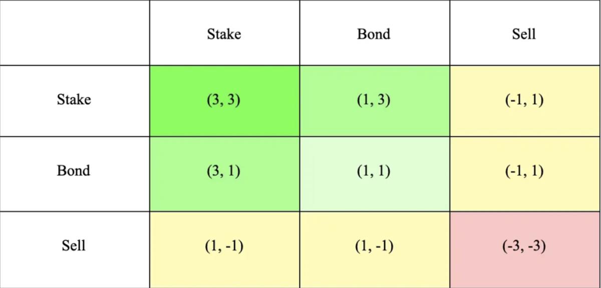 ve(3,3) 模式:VE(3,3) 模型结合了 Curve 的 ve 模型和 OlympusDAO 的(3,3)博弈模型。(3,3)指投资者在不同行为选择下的博弈结果。最简单的 Olympus 模型包含 2 个投资者,他们可以选择质押,债券,卖出三种行为。从下表可知,当双方投资者均选择质押时共同收益最大,达到(3,3),意在鼓励合作和质押。