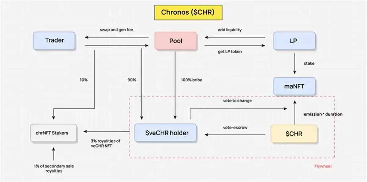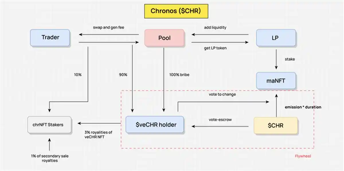 以 Chronos 为例,在抽象其 Value Flow 的时候,我们需要先抽象出关键的利益相关方,比如,Trader,LP,veCHR 的 holder。关键的利益相关方是再分配的参与者,也是 Value 流动的节点,价值在这些相关方之间流动,并按照机制设计进行收益再分配。