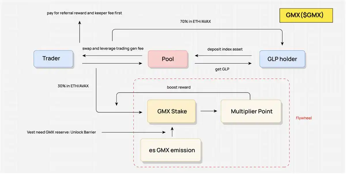 GMX 的核心博弈机制是设计来再分配 30% 的真实收益。这个比例是固定的,但 GMX 的持有者可以通过不同的策略来影响自己能够分得的收益比例。例如,用户可以通过质押 GMX 来获得 esGMX 的奖励,而 esGMX 的解锁则需要 GMX 现货质押,同时还需要满足一定的解锁周期。此外,质押 GMX 还会获得 Multiplier Point,虽然这部分奖励无法直接变现,但它可以增加用户的分润比例。