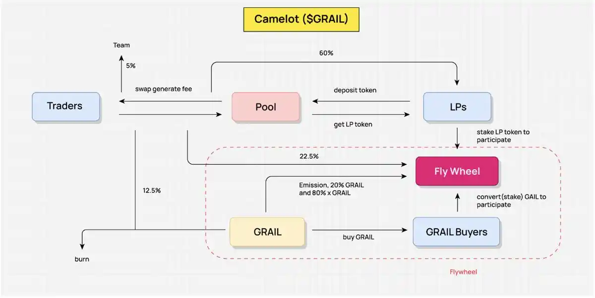 Camelot 的核心激励目标是鼓励流动性提供者(LP)持续提供流动性,以保证交易者可以享受到顺畅的交易体验和充足的流动性。这个设计以激励机制确保了交易的流畅性,并帮助 LPs 和交易者共享产生的收益。