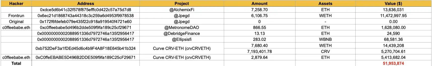 至于具体的实际损失,派盾稍早前统计分析称,包含 Alchemix (alETH 发行商)、 JPEG 'd(pETH 发行商)、 Metronome (msETH 发行商)、 deBridge 、 Ellipsis 、Curve CRV -ETH 池在内的损害合计约为 5200 万美金。