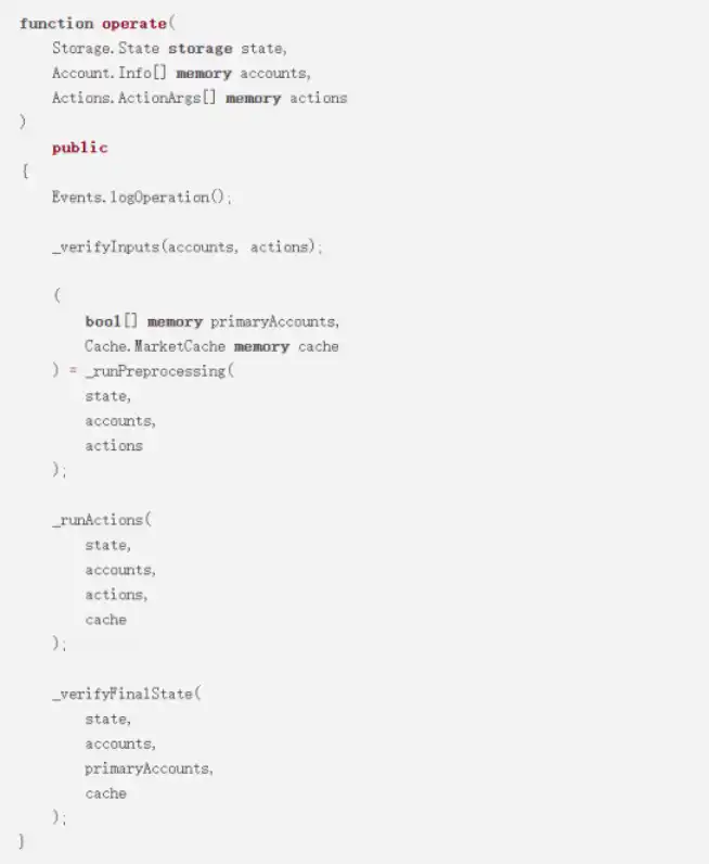 根据 Nascent 成员 Brock Elmore 解释的 FREI - PI 模式为:「功能需求-影响-交互-协议不变式(Function Requirements-Effects-Interactions + Protocol Invariants pattern)」,这里以 dYdX 的 SoloMargin 合约(源代码)为例,这是一个借贷市场和杠杆交易的合约,即为 FREI-PI 模式的绝佳范例。这是早期借贷市场中唯一没有任何市场相关漏洞的借贷市场。
