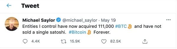 当然,这种信仰并不是停留在口头上,Michael Saylor 自己也积极购买 BTC。2020 年 10 月 28 日,Michael Saylor 曾对外宣布他拥有 17732 个比特币。今年 5 月,Michael Saylor 发布 Twitter 表示,其控制的实体累计收购了 11.1 万枚比特币,而且没有出售一聪(satoshi)。这个总数包括当时 MicroStrategy 的 92079 枚 BTC,也包括 Saylor 的个人比特币储备。