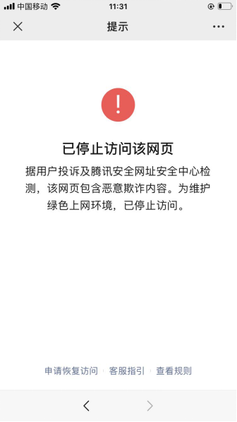 “金融1号院”也尝试下载披萨狗的App以查阅相关资料,但是其下载链接显然已被拉黑。1号院在微信中打开官方给出的IOS端口的App下载链接后,得到的是该网页因“因包含恶意欺诈内容”,已被停止访问。