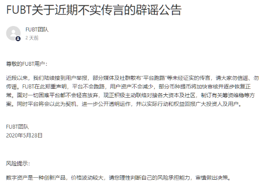 此外,另一家更知名的交易所,号称全球排前30的香港富比特(FUBT)交易所在5月27日被曝“人去楼空”,引起币圈轩然大波,随后在5月28日进行辟谣称“不会跑路”。