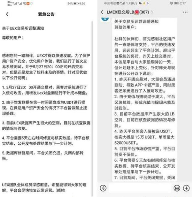 无独有偶,近期“停止提现”的交易所可不止披萨狗一家,像是UEX交易所、LMEX联交所都发出了相关公告。原因均为在5月27日遭受黑客攻击砸盘,被迫关闭交易。