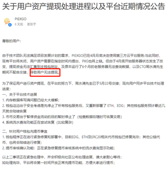 加密数字币交易所PIEXGO,也就是币圈所称的披萨狗交易所,近期被用户反映无法提币,对此,交易所在8天前发布一则“关于用户资产提现处理进程以及平台近期情况公告”予以“解释”,大意来讲就是“现有平台将关闭,用户资产需要在指定时间内提出”。但因为一系列原因,如“资金无法汇集到主钱包地址”、“数据无法查询”以及“CTO不配合”等,导致用户无法提现。目前各项功能正在紧急修复等等。