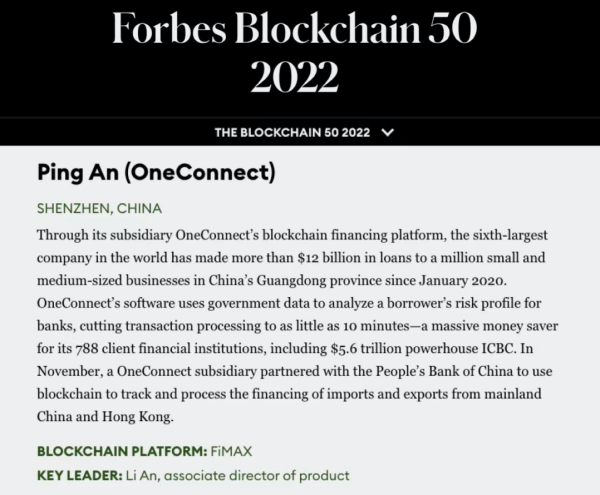 2月8日,福布斯发布2022年“区块链50强”榜单,金融壹账通连续第二年入选该榜单。金融壹账通此次入选榜单的两个区块链赋能项目,即获得了国际认可。技术上,金融壹账通通过自研区块链底层、金融级安全保障等优势实现了高并发低延迟,以同态算法和零知识证明支撑的隐私计算领先于市场水平;产品上,成熟产品降低区块链使用门槛,成熟模式支持应用快速落地;服务上,解决方案专家结合丰富的项目落地经验,支持应用实现价值。