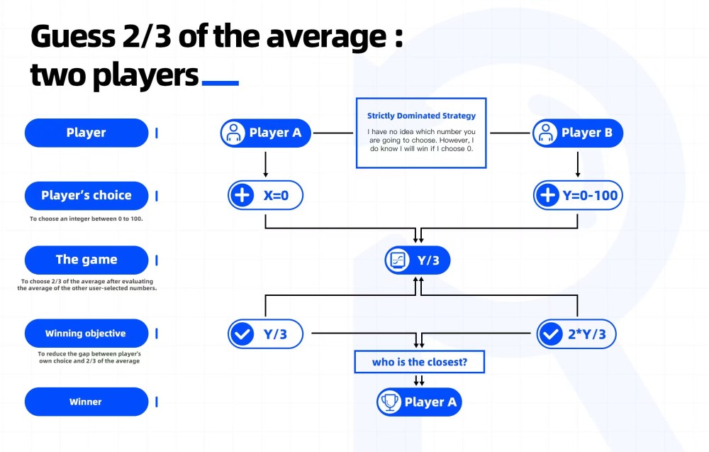 简化为最本质的形式,两人游戏实际上是“谁选择较小的数字获胜”的场景。由于游戏的自由度较低,玩家只需选择比其他玩家更小的数字即可赢得游戏。因此,对于所有玩家来说,“严格优势策略”是选择 0。