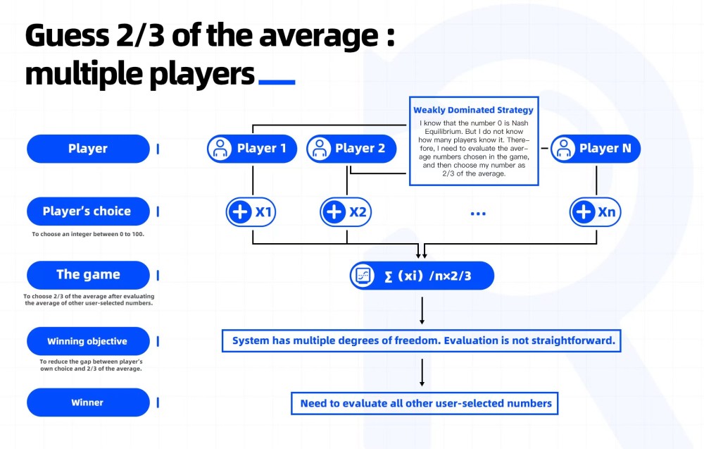 多人游戏相比两人游戏,自由度更高。它的基本机制是预测所有玩家的平均数。简单地选择最小的数字 0 不会赢得比赛。