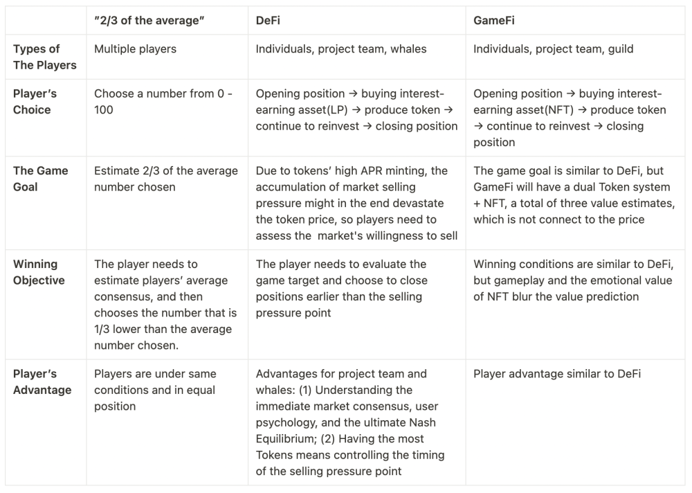 作为金融领域的经典游戏,“猜测平均数的 2/3”的博弈范式体现在区块链玩家对项目信息的认知、代币价格预期以及未来商业运营的博弈中。在本文的后续章节中,我们将详细解释普通用户、项目方、鲸鱼、游戏公会等各类玩家在 DeFi 和 GameFi 领域是如何玩共识游戏的。