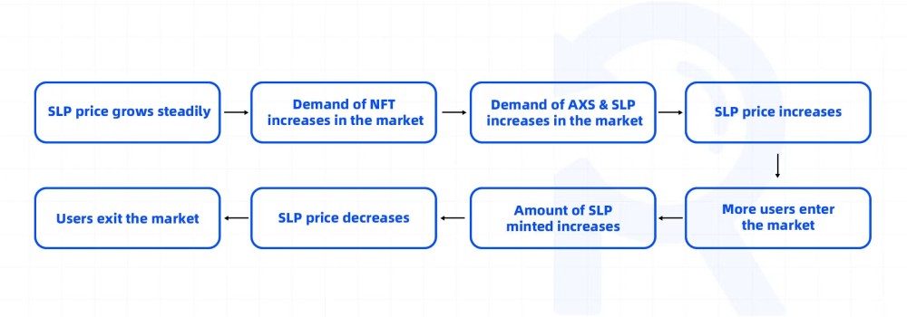 鉴于 SLP 的高通胀经济模型,SLP 将不可避免地继续下降。当新加入的玩家数量开始减少时,对 Axie NFT 的需求也会减少。如果没有更多的消耗方式,SLP价格将会下跌,这将进一步降低 NFT 的生产率。Axie NFT 的增长率将变为 0。