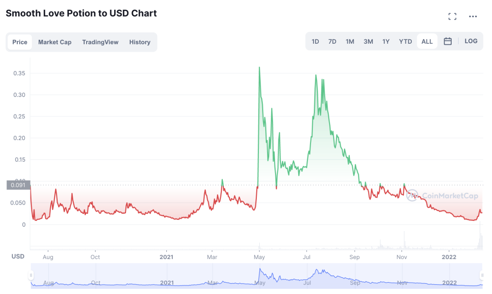 尽管 SLP 价格在 2021 年 DeFi 夏季持续上涨,但仅持续了 4 个月。在 7 月达到顶峰之后,SLP 再也没有回到巅峰时期。