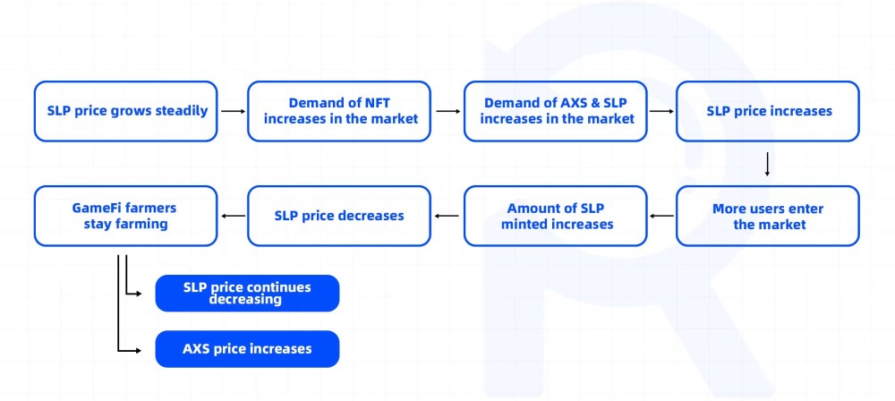 在AXS和SLP的产出未能满足消耗前,两种代币的价格都会一直上涨。实际上,玩家烧掉 AXS 和 SLP 来生成 Axie NFT,然后将其用于生成 SLP。然而,SLP 并没有太多降低通胀的方法,导致 SLP 承担了所有三种资产的全部抛售压力。