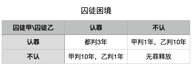 这个时候甲就会分析:如果我认罪,我的结果是1年或者3年。如果我不认,结果是无罪释放或者10年。从结果来看,甲大概率会选择认罪。同样的,乙也会这么分析,所以结果大概率是甲乙两人都选择认罪。虽然两人都不认罪的结果是对两人这个共同体来说是最好的,但在保全自身的利益下,认罪才是对自己最好的选择。