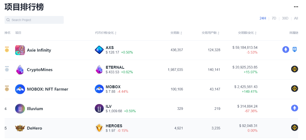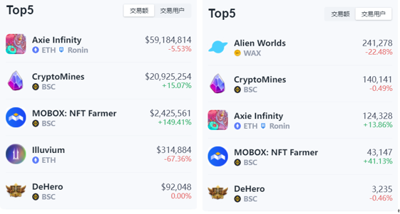GameFi市场数据的右侧是按以24小时时间维度变化的Top 5项目,用户可根据交易额和交易用户数直观地看到近24小时内较为热门的项目,如果有新项目登上该榜,也能帮助用户更好地发现短期内市场的波动。