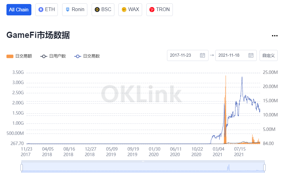 进入专题页面,首先映入眼帘的是GameFi市场的整体走势。用户可以通过日交易额、日用户数和日交易数的变化,按7D、1M、3M、YTD、ALL这5大时间维度感知市场冷暖。进入后系统默认呈现的是收录所有链的数据,用户可以根据自身需求,任意切换至以太坊、Ronin、WAX等公链。