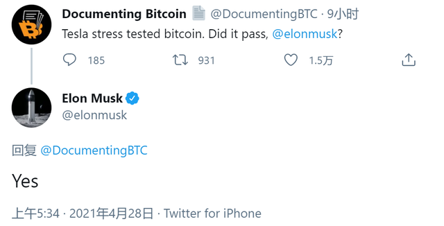 今年3月,马斯克接连宣布特斯拉收购价值15亿美元的比特币以及特斯拉接受比特币支付两大消息。随后,马斯克更是在回应网友提问“比特币是否通过了特斯拉的压力测试”时给出了肯定的答复。