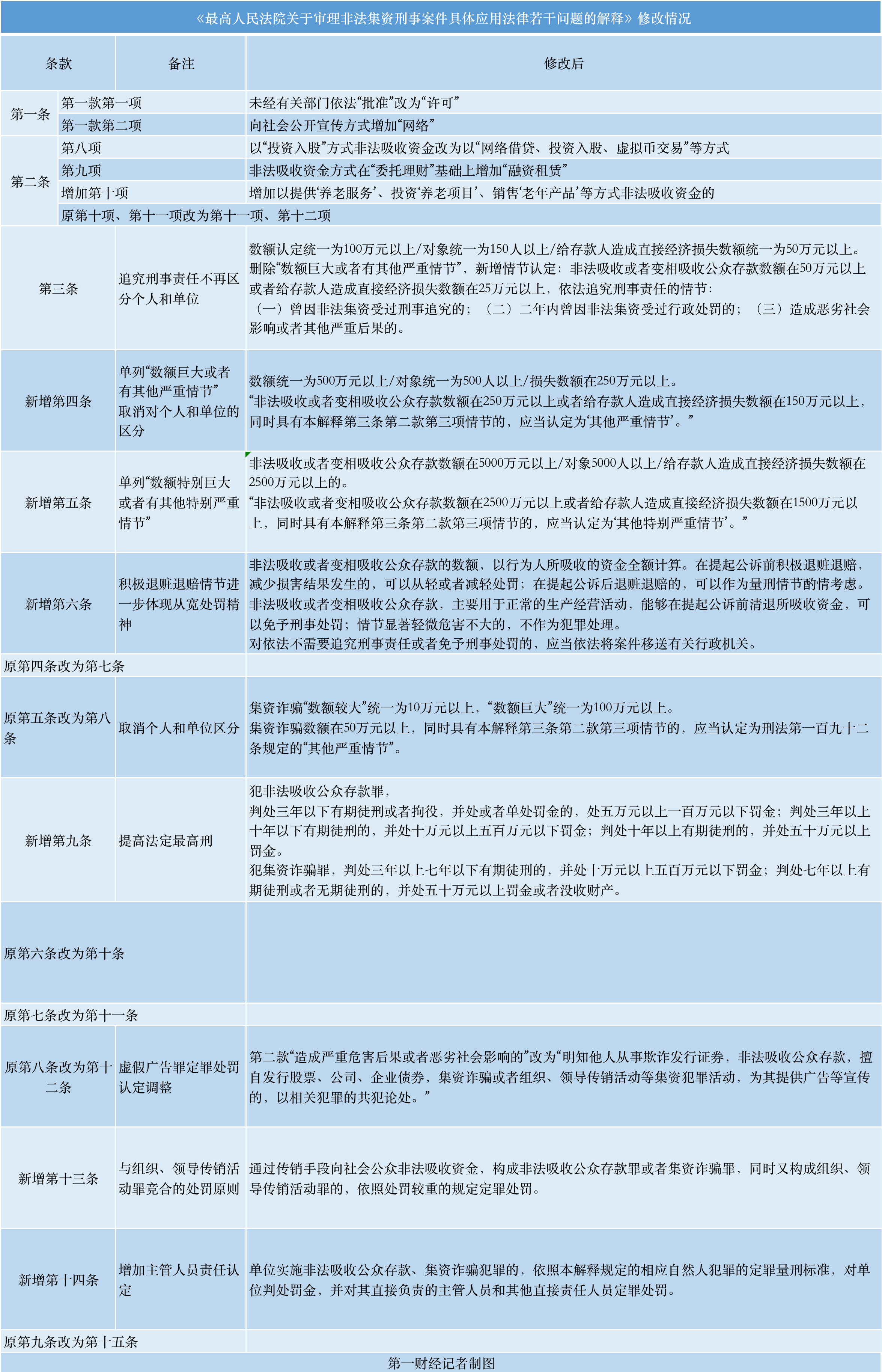 具体来看,修改后的《解释》条文从9条增加至15条,主要对原来的5个条文做出修改,修改内容涉及非法吸收公众存款罪、集资诈骗罪的定罪量刑标准,特征要件和行为方式、罚金金额标准。同时,新的《解释》还明确了两项罪责与组织、领导传销活动罪竞合处罚原则等。