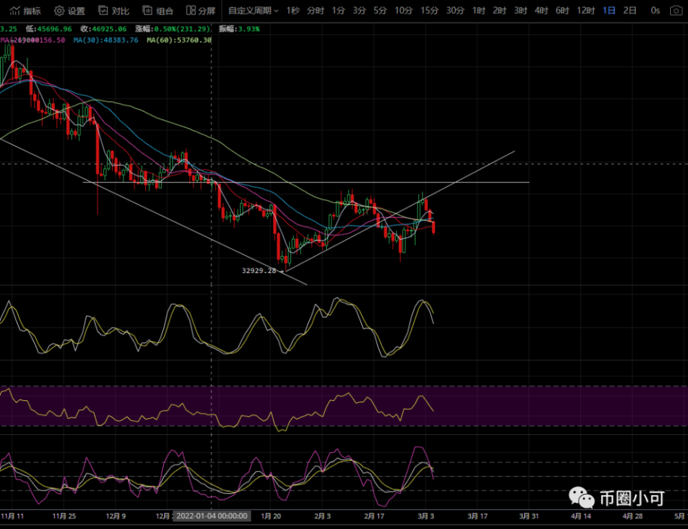 大饼日线下行,没啥说的,4小时指标见底,阻力位42000附近,承压位38500
