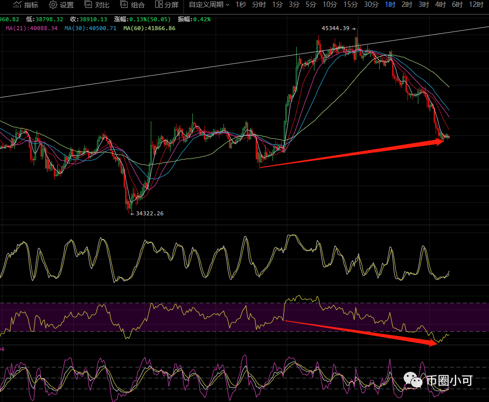 小时线RSI指标背离形成,做短线的小伙伴们可以是当抄底,止损38900,止盈40000附近,切勿卡点做单!!!