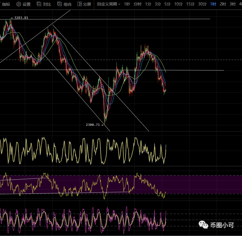 姨太日线跟大饼差不多都是处在下行中,小时线虽然指标触底,但是反弹力度不大,短单注意点位2580,4小时KDJ金叉成形,但是处于日线下行,反弹力度不大