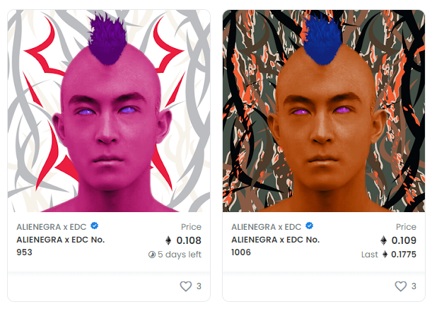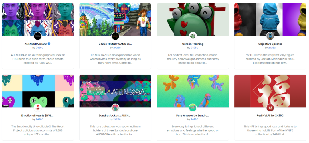 EDC先行成立了平台2426C,开发一系列虚拟艺术产品,首轮产品RED NVLPE系列包括Dr.Woo、Heart NFT x Emotionally Unavailable、XIN YU、James Fauntleroy、CLOT、EDC x EGRA、Objective Collectibles以及Sandra Jockus在内的8个艺术单位,总计8888件艺术作品。