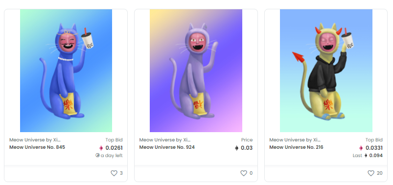 也就是说,入场投资者人均亏损了2162元,甚至,另外七位艺术家的作品中甚至有跌到0.03ETH的情况(约为558元人民币),门可罗雀,无人问津。