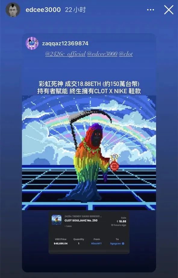 事实是,他的确很认真,从2426C初次发行以来,他前后分别亲自发布视频教程、妻女出镜宣传、点名其他有影响力的意见领袖们帮忙站台带货、甚至还赋予个别NFT持有者特殊权限赋能——终身拥有Clot x Nike鞋款等,可谓不遗余力。