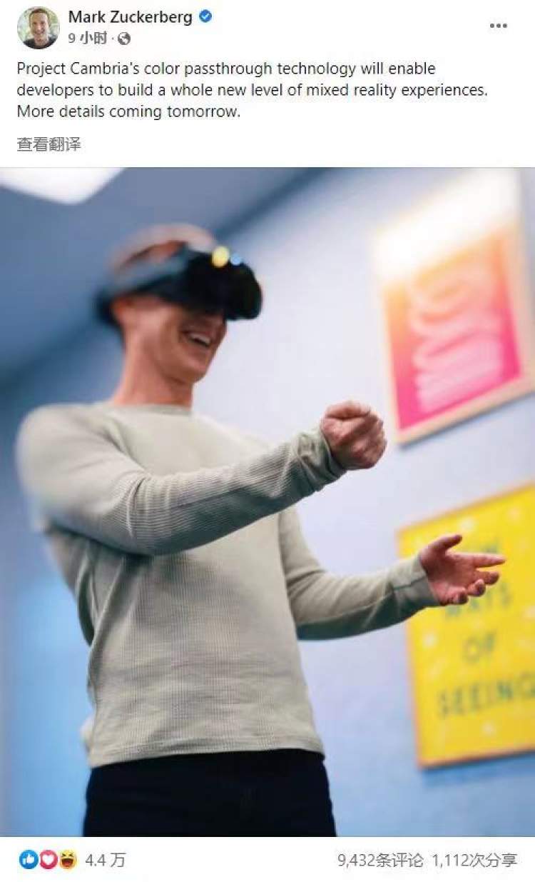 5月12日,Meta首席执行官扎克伯格在他Facebook上发布了新帖子:“Project Cambria的彩色Passthrough技术将使开发者能够建立起全新的混合现实体验水平。明天会有更多的细节。”