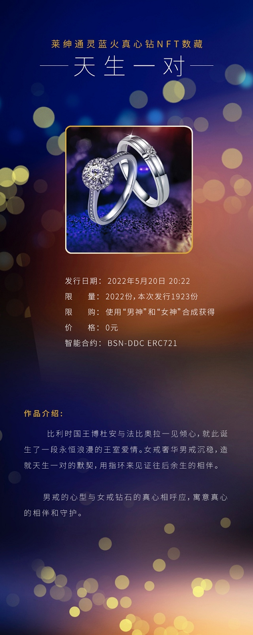 莱绅通灵蓝火真心钻NFT数字藏品本次发行的作品一共三款各2022枚,分别为“男神”、“女神”和对戒“天生一对”。其中“男神”和“女神”均可以在数藏中国平台免费抽取,对戒“天生一对”则作为隐藏款。附加了爱情属性的NFT戒指,让年轻人的告白、求婚即使在数字世界里也拥有满满的仪式感,对每一位拥有者来说,都象征着代表“唯一”的爱情。