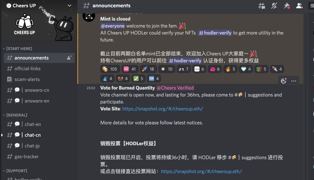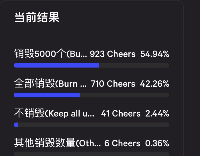 今天老雅痞发稿前,discord刚刚宣布了截止目前两期白名单mint已全部结束,销毁投票现已开启,投票将持续36小时,对于未mint资产销毁的处置,如出现保留,将全部进入国库(持有国库资产的地址无投票权),未来全部用于项目及社区建设,不进行公售或空投。