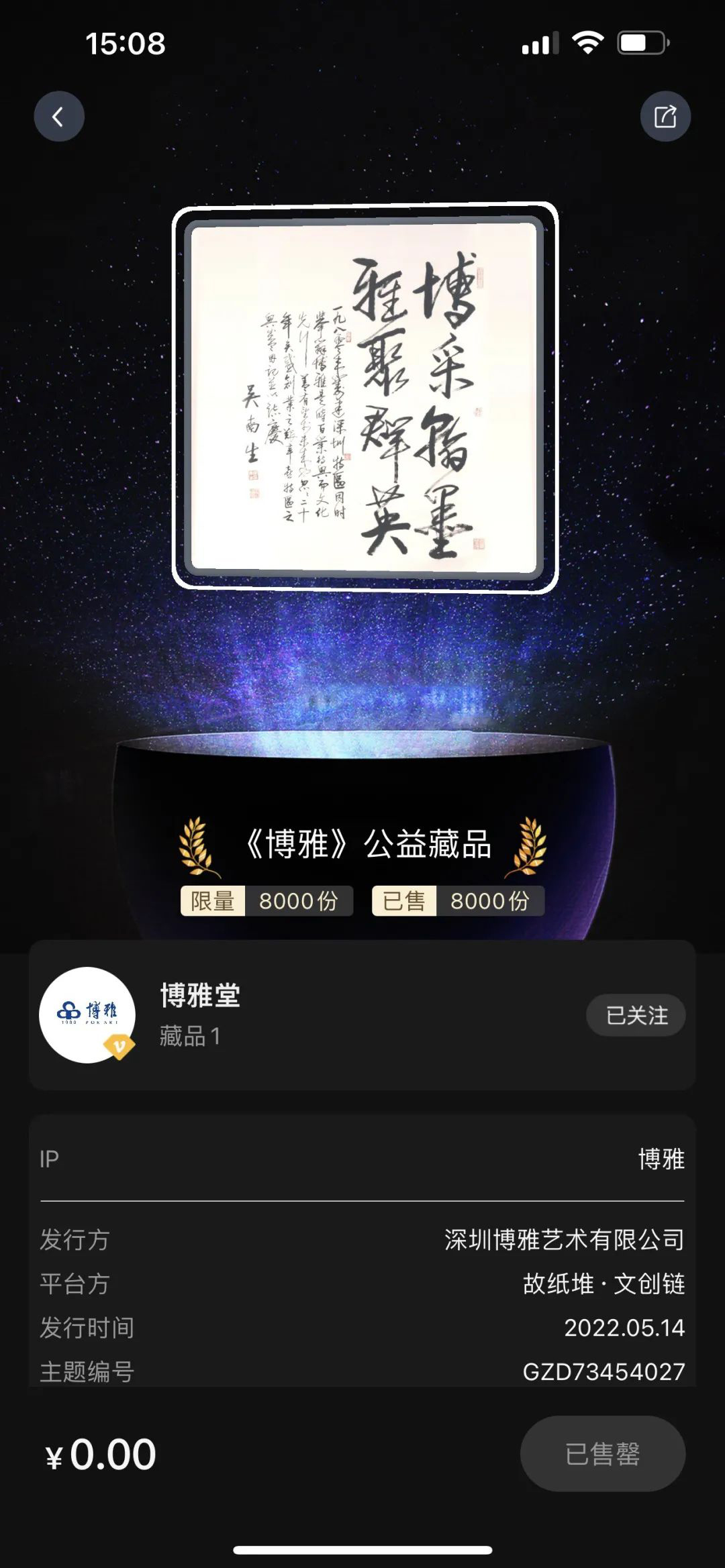 在那天的博雅讲堂上,多亏身边小朋友用手机点来刷去的帮忙,我才拥有了此生第一份NFT数字藏品:原深圳市委第一书记吴南生的一幅书法作品图片。这是博雅首款数字公益藏品,免费发行一万份,上线不多时即争抢一空。
