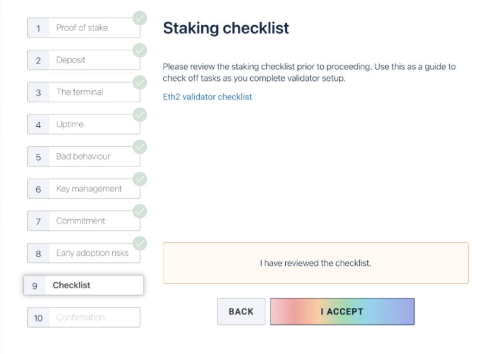 第一步是阅读给定的建议并同意在安装验证器客户端软件之前仔细理解它们并质押 ETH。