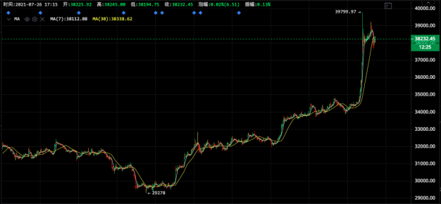 7月26日,加密资产市场时隔2个月迎来大幅上涨。BTC由35380美元的开盘价最高触及39799美元,日内最大涨幅12.49%。ETH、LTC、UNI等主流资产同步跟涨,市场一扫往日阴霾。