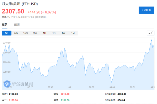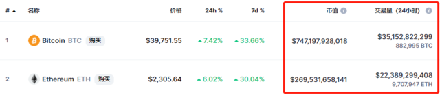截至本文发稿,以太坊现报2307.5美元;比特币现报39819美元。
