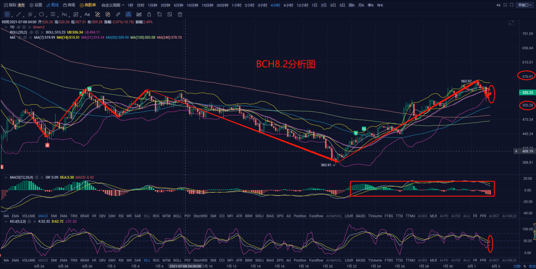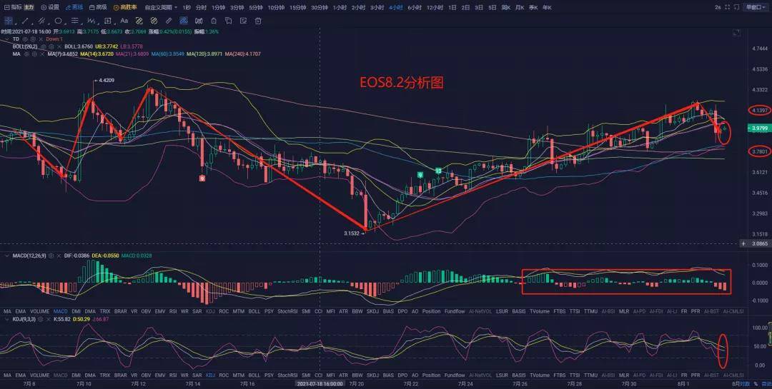 昨日柚子也是紧随大饼走出强烈回调趋势,四小时线一根大阴柱向下跌破,至今日最低触及3.85美金附近后,出现了强烈的触底反弹趋势,与大饼走势是相差无几的,昨日紧随学姐空头策的小伙伴们,目标点位也是完美实现,照常恭喜跟上的小伙伴啦。当下技术面来看,本日四小时线上MA5日均线出现了明显的拐头朝下的趋势,这里MACD多头趋势明显出现缩量,KDJ底部三线呈金叉结构,后续有走高的欲望出现。综合来看当下行情,多头方面更占上风,但这里也不能排除是诱多的走势出现,小伙伴们仍需多多注意提防。则当下价格如若企稳4.1美金之上则会再次走出拉升局面,如若未能企稳将会进入阴跌局面。本日思路上继续保持高空低多策略即可。下方支撑暂看3.2美刀一线不变,上方强压关注4美刀一线。