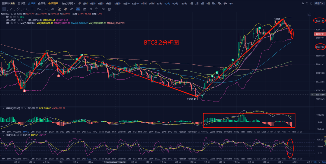 比特币昨日整体是以一个震荡下行趋势为主的,与以太不同,以太还会走一轮涨幅而大饼都不带涨就开始直接出现极速下跌,至今日早间最低跌到39240美金附近,昨日紧随学姐空头策略的小伙伴们,目标点位均完美实现,千点区间再次完美抓取,恭喜跟上的小伙伴啦。当下从技术面来看,日线上MA5日与MA10日均线一样,仍是走出上行趋势,但昨日日线是以阴K收尾的,连续10日的阳K收尾盘面,最终是被近两日的回调局面给打破,目前MACD也是维持多头量能不变,但这里KDJ三线高位走出死叉结构,可以看出后续有强烈的回调欲望,这里布林带当前整体还是一个持续走高的阶段,当前按狄马克排列为TD13,这里先提醒大家一下币价后续有回调急跌的可能出现。则四小时线上MACD与KDJ指标均是走势下行趋势轨迹,MA5与MA10日均线均是走出朝下的姿态,整体就日线而言,TD13已形成走出强烈回调欲望,那么接下来几天都会以一个高空下跌的行情为主。高位追多的小伙伴们,一定要提前预防风险管控哦,下方支撑参考38000一线,上方压力位参考42000一线。 ETH