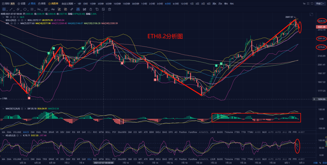 昨日以太如常也是再一次的走出拉升局面,至今日凌晨最高冲击到2697美金附近后,开始出现了回调趋势,昨日紧随学姐多头策略的小伙伴们,目标点位为逐一完美实现,恭喜跟上操作的小伙伴啦。当下从技术面来看,4小时线上当前K线处于MA5日均线下方,出现了明显拐头朝下的迹象,但MA10日与MA30日均线仍是一个走高的形态,而力度上也是有所减缓的,MACD当前呈金叉结构,多头量能上出面有缩量迹象,KDJ底部三线有朝上的趋势,后续有金叉形态的欲望,就当前这个情况而言,预计日内走势还是会以一个震荡上行趋势为主,而后预计在2650-2680附近出现回调,这里这个回调也是因为日线价格与MA5日均线之间出现的缺口,回调的目的也是为了修复这道缺口而已。下方支撑关注2400-2300一线,上方压力关注2700-2750一线,如若后续日线2400强支撑出现有效性跌破,那么后续币价还将持续性下跌,如若下午价格未能有效跌破下方支撑,那么后续币价整体仍会以一个震荡上涨为主。