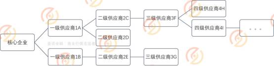 图2 传统供应链金融下多级供应商融资难问题 图2中,传统供应链金融的逻辑只解决了一级供应商融资的问题,二级、三级….N级供应商的融资难以解决的原因有如下几点: