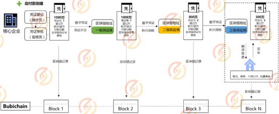 整个链条上的企业债权流转过程记录在链条上,形成合约,且区块链具有不可篡改的特性,核心企业信用经过多个供应商流转后不衰减,核心企业付款后,资金将按智能合约的规则自动化清算,资金提供方有良好的回款保障。