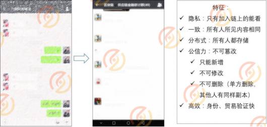 有无区块链的区别。如图4所示,传统体系下,“贸易”和“融资”是两个分离的环节,企业A、企业B做完贸易以后,A拿着贸易信息找银行C融资,银行C担心A提供的信息是否真实,要花费很大的代价来做验证。(用微信做比较,相当于,A、B私聊记录,拿去给银行C看,银行担心真假)。区块链体系下,A、B做贸易的同时,银行C就在“见证”,这样一来,A拿着贸易信息找银行C融资,银行C可以从本地见证到的数据里面核对真实性。(用微信做比较,相当于,A、B、C群聊,银行C本地数据可以验证,且效率高,只要保障身份、交易合约的法律效力)。