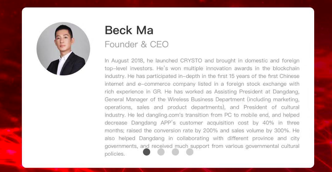 CRYSTO官网介绍显示,项目创始人及CEO为Beck Ma,履历包括当当网助理总裁等职位。其应是俞渝此次长文中提及的,疑与李国庆私交甚深的马铭泽。在微博等社交平台,也曾有李国庆与马铭泽的互动信息。