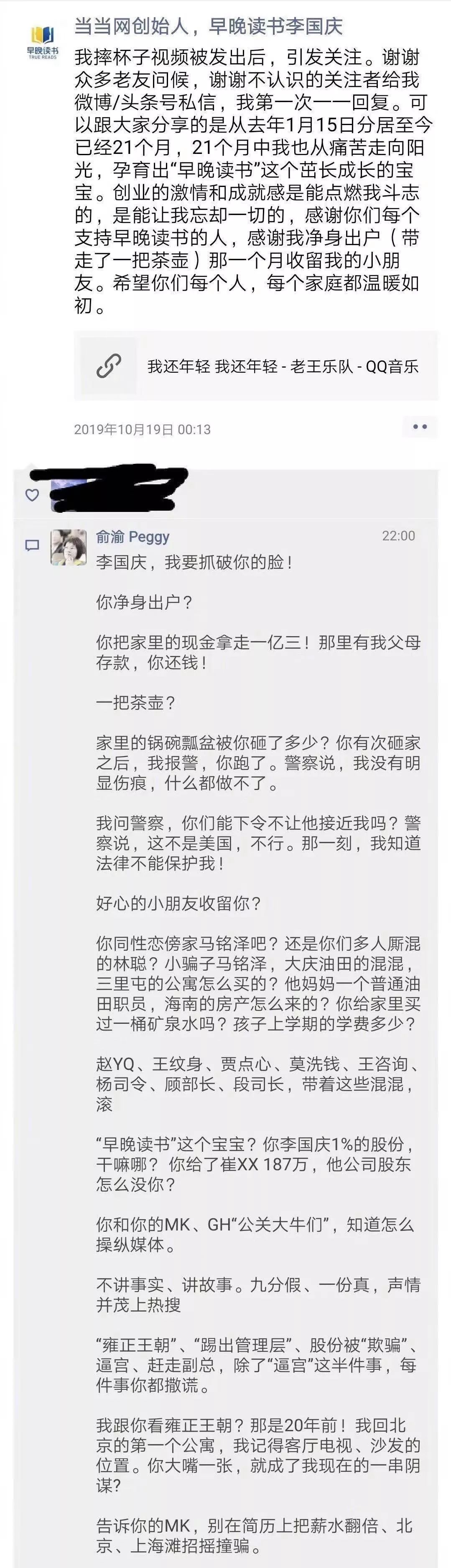10月23日晚间,当当网董事长兼CEO俞渝在丈夫李国庆朋友圈发长文留言,驳斥李国庆相关言论,否认关于李国庆净身出户的说法,并称其带走一亿三现金,涉及俞渝父母的存款,并斥其作秀、更曝出众多惊人内幕,包括李国庆与当当网前文化产业董事长、现CRYSTO项目CEO马铭泽的私人关系、及其与李国庆过往的婚姻经历。
