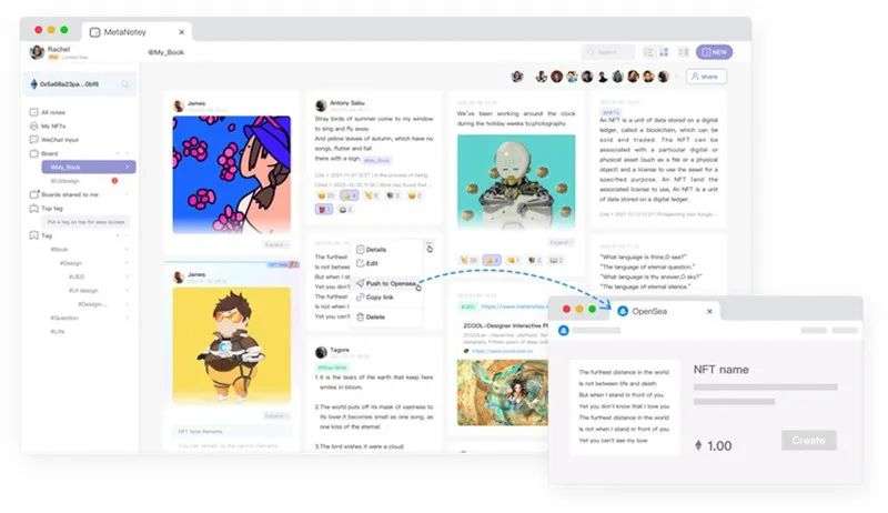 ALL IN Web3.0后,郑小岳和团队打造了MetaNotey平台,是以笔记为起点,集合钱包、NFT铸造、交流功能的去中心化社区平台。目前支持用户通过以太坊/Polygon链将创作内容生成NFT,并将逐步引入更多联盟链,公链。从而打造一个跨所有主流区块链的NFT内容通用交流平台,最终达到降低大众用户的使用门槛的愿景。